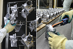 ![]() ショットブラストダイカストにつきものである「バリ」を高効率に処理。製品形状や要求品質に合わせてエプロン式、ハンガー式の2種類のマシンで対応。 |