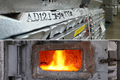 ![]() 溶解アルミ合金を700℃で加熱し液化します。アルミダイカストの代表的な材料である「ADC12」以外の特殊材料も対応可能です。 |